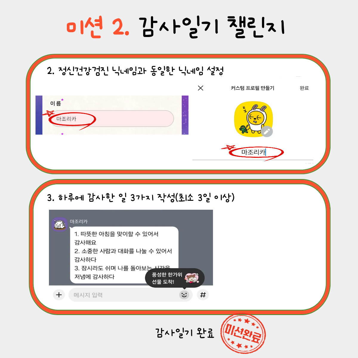 - 미션 1 완료 및 미션 2 ‘3일 감사일기’ 완수자 중 80명 랜덤 추첨